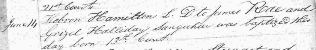 Hebron Hamilton Rae was my 2nd great grandfather, Thomas Rae’s sister. She was named after her grandmother and my 4th great grandmother, Hebron Hamilton. Young Hebron was born on 13 June 1835 in Sanquhar, Dumfriesshire in the South of Scotland. Her parents were James Rae, a coal miner and Grace (or Grizal, another great name) Halliday.
