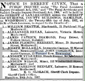 I had known that he died at quite a young age in 1917 leaving behind a wife and four children. He married Mary Lynch in 1908 in St Brigid’s RC Church in Newmains. Twins Peter and Mary Ann were born in 1909, Catherine in 1910, Patrick in 1912, Elizabeth in 1914 and Thomas on Christmas Eve 1915. Catherine and Elizabeth both died in infancy. His death would have been particularly hard on Mary with such a young family to look after and having already lost two babies. The circumstances surrounding John’s death are quite horrific.