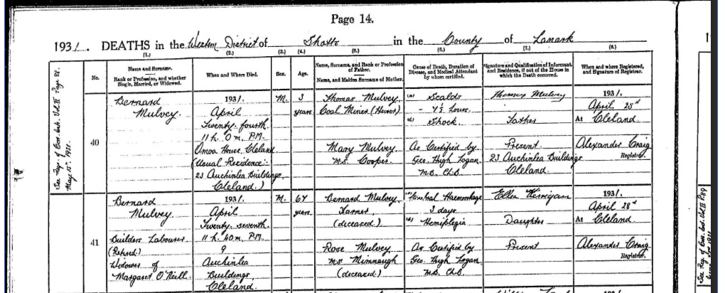 The circumstances of Bernard’s death must surely have shaken the family and the whole community.  It certainly led to a further tragic event. If you look at the death register you will see that the second name on the page is also Bernard Mulvey. He was young Bernard’s grandfather. On the day of the toddler’s death his grandfather suffered a cerebral haemorrhage and died 3 days later. I don’t know if Bernard Snr witnessed the accident or if he was present at the hospital but whatever the case it would seem that the shock of it was too much for him.