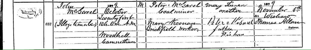 Mary found work as a brickfield worker, a physically demanding and low paid job. She met coal miner, Peter McGarrell and on 21 October 1879 their son, John McGarrell was born. The child was illegitimate and while Peter acknowledged paternity on the birth register the couple never married and Mary and her new baby remained at home with her parents and siblings. Without the support of a husband Mary would have had to greatly rely on her mother and sisters for support.