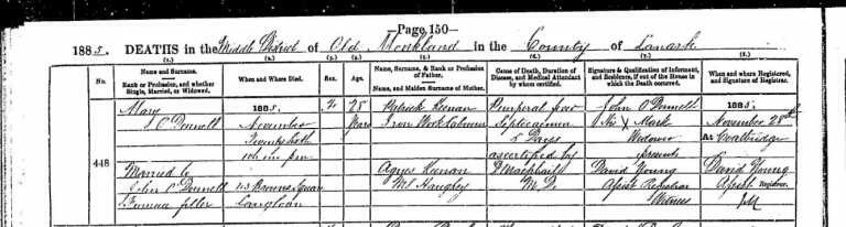 Mary was the first of ten children of Patrick Keenan and Agnes Haughey. The next two siblings were born in Shotts but by 1862 the family had settled in Newmains.