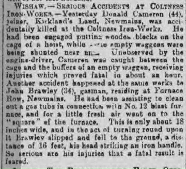 John was employed as a furnace tube cleaner at Coltness Ironworks. The local newspapers would regularly report on accidents at the works and this article describes what happened to John.