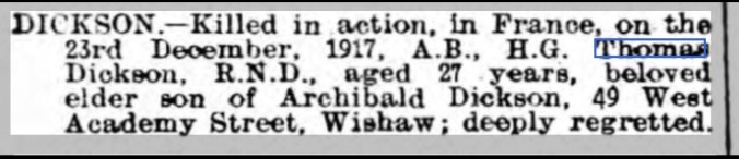 Thomas Dickson was born on 1 January 1891 in Wishaw, Lanarkshire. He was the third of eight children and the eldest son of Archibald Dickson and Elizabeth Stevenson. Archibald was the brother of Livingston Russell Dickson, my father’s paternal grandfather. I have previously posted about Thomas’ cousin, Archibald Dickson who was killed in France in 1918.