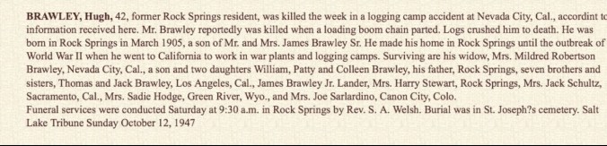 Hugh Brawley was born on 8 April 1902 in the town of Rock Springs, Sweetwater County, Wyoming, USA. His father was James Brawley, younger brother of my great grandfather, Daniel Brawley. James left Newmains in 1888. Hugh was the seventh of eight children. His mother, Sarah McGlynn was born in Pennsylvania.