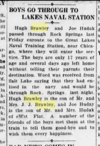 In 1919, without telling his parents, young Hugh and a friend left Wyoming and headed to Illinois to join the Navy. This article from the local paper tells of how they later passed through their home town. I wonder if he’d been refused permission to go and what his parents reaction might have been.
