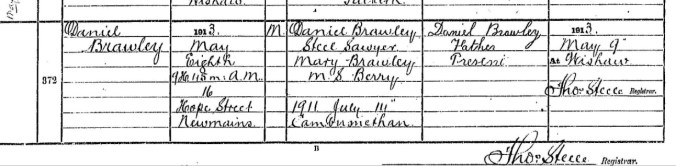 Daniel and John Brawley were born on 8 May 1913. Their father was Daniel Brawley, my maternal grandfather’s eldest brother. The twins’ mother was Mary Berry. This was Mary’s second pregnancy; their daughter Margaret having been born the previous year.