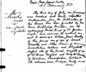 His decision to leave Scotland clearly had something to do with a certain young lady. It was on 3 July 1920, in the parish of St Ignatius of Loyola in Montreal, that he married Elizabeth Sandford. The Sandford family were from Wishaw. There is a record of Elizabeth working in Canada as early as 1916. Elizabeth’s brother, Matthew Sandford had married James’ sister, Sarah in 1916 in Newmains.