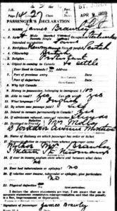 James remained in the navy until 1919 when, not content to return to life in Newmains, he decided on a new life in Canada arriving there in April 1920. The record below gives James’s religion as Protestant. I don’t know if that’s an error or if he deliberately tried to hide the fact he was Catholic.