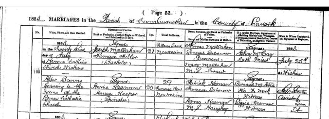 On 23 July 1883 Ann married Joseph Mollahan at the Roman Catholic Church in Wishaw. This was before there was a Catholic church in Newmains. Ann’s sister Elizabeth was her bridesmaid.