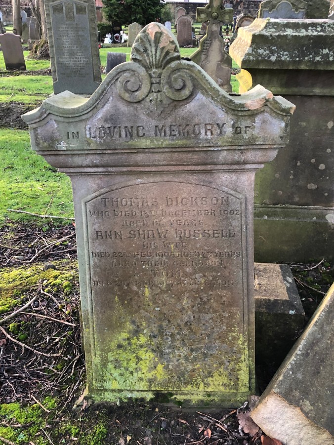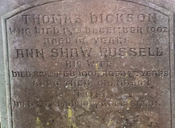 It’s not very clear but underneath the names of my great great grandparents Thomas Dickson and Ann Shaw Russell I saw that buried along with them was “their grandson TOM”.