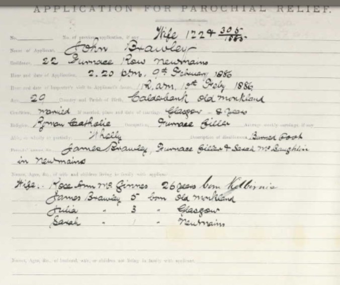 I didn’t know that in 1886 he had made an application for poor relief. His application shows that he was a furnace filler but in February 1886 he was unable to work due to a burned foot. I didn’t find any further information on the cause but a check of local newspapers shows that working at the Coltness Ironworks was not without its risks. There are regular reports of serious and even fatal accidents. Of course, that is where John eventually met his end.