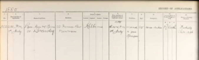 The record gives his parents name and even his father’s occupation. You can see that he followed his father’s footsteps. It also names his wife and children and here is where I discovered Julia Brawley who was age 3 and born in Glasgow.