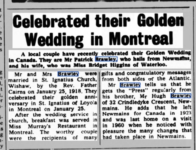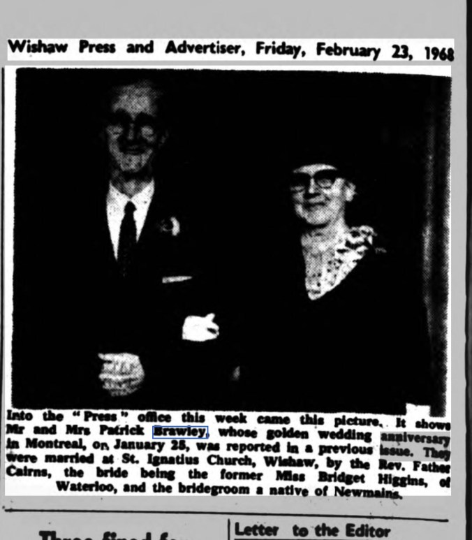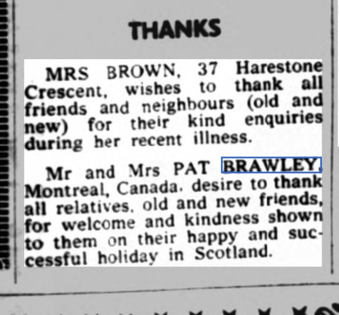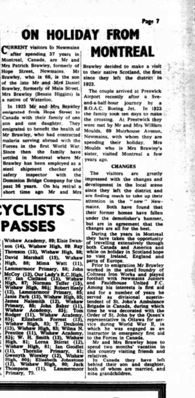 My grandfather’s brother, Patrick Brawley was born in Newmains on 7 February 1894. In 1923 he left Scotland for Canada where he made a good life for himself and his family. A return visit to Newmains in 1960 generated some interest in the local press. My mother remembers his visit well. Even after 37 years Uncle Pat’s Scottish accent was strong as ever. He said at the time that if he’d known how much the village would have improved he would never have left.