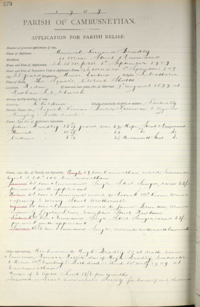 In September of 1909 and again in October Hannah went to the parish for help. Once again I find the poorhouse applications to be a great source of information as it lists all of the family members. The record shows gives details of their spouses and occupations and tells me who is still living at home. Given that there was still some income in the household Hannah’s application was refused. It was left to the family to come together to support their widowed mother and younger siblings.