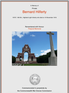 In 1913 he married Catherine Hanna and it may be hoped that this helped to settle him down. His marriage may have been seen as a fresh start with hopes of a family of his own. The world as he knew it changed, of course, with the outbreak of war in 1914. From criminal/labourer Bernard became a soldier in the 16th Batallion of the Highland Light Infantry. Private Hilferty (as his name is recorded in army records) 19727 went to war and fought in France and Flanders. On 18 November 1916 Bernard was killed in action. Click here to find out more about that day. His name commemorated at Thiepval Memorial in France.