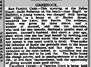 With no father and a mother who was working long hours to feed her family there was nobody to keep young Bernard in check and it wasn’t long before he was on the wrong side of the law. To be fair, he may not have had the best role models. In September 1881 his mother appeared before Baillie Shankland on a charge of disorderly conduct. In 1885 she was convicted of assault having punched her sister in the face.