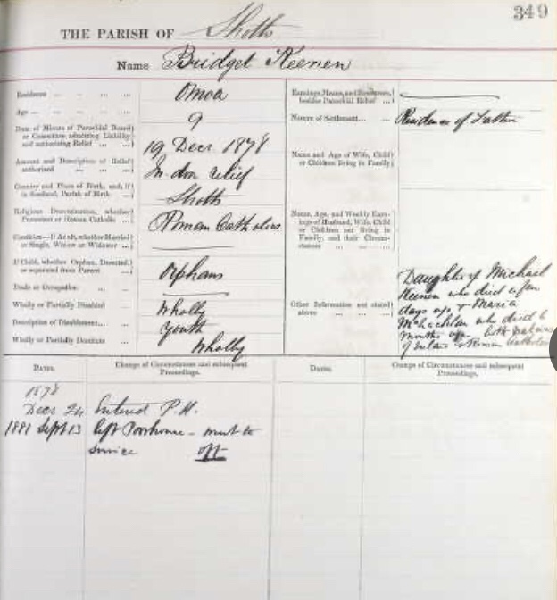 One after another their details were taken in the poorhouse register. As the eldest, Sarah was spoken to first. The record seems very matter of fact about her circumstances. It was noted that she was an orphan and wholly disabled (ie unable to work) through “youth”. The details of her parents deaths are recorded along with the fact that they were both Roman Catholic.