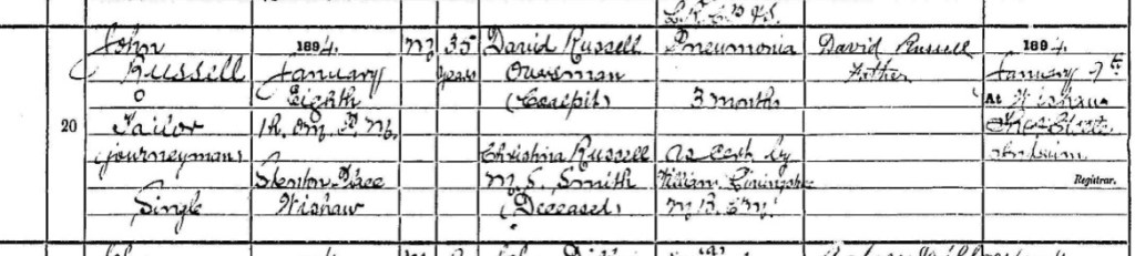 Indeed, so very sad! I see you have read both my blog posts on my great uncle John Dickson, born John Russell. His birth mother was born in Cambusnethan. He and my grandfather were both born 1882 and were adopted cousins, from birth parents of entirely different families. Another set of Russell, who spent years in Cambusnethan were also prominent in my book, but not my blog. I learned something very valuable about researching Russell from the latter – due to the way double “s” used to be written, those who have interpreted the BMD in today’s hand, get it wrong – searching for Rup* often finds some lost souls.