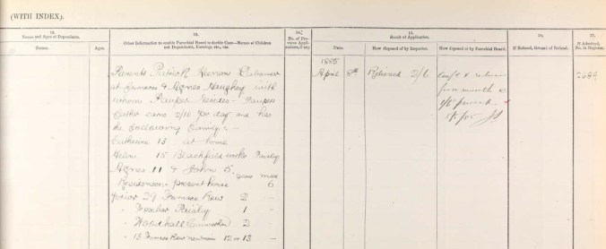 In the case of Margaret, I discovered that she applied for poor relief at 230pm on 7 April 1885. I would imagine that for a 17 year old girl bring interviewed by the poor house inspector would have been a very daunting prospect.