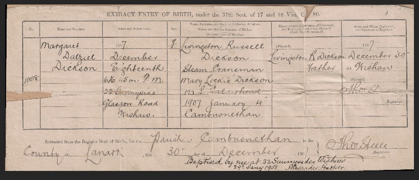 Margaret was born in the family home in Glasgow Road, Wishaw. She was the eldest child of Livingston Russell Dickson and Mary Lockie Calderhead and she was named after her maternal granny. The paternal side of my family do like to use ancestors’ surnames as middle names and that can be very useful in helping track them down.
