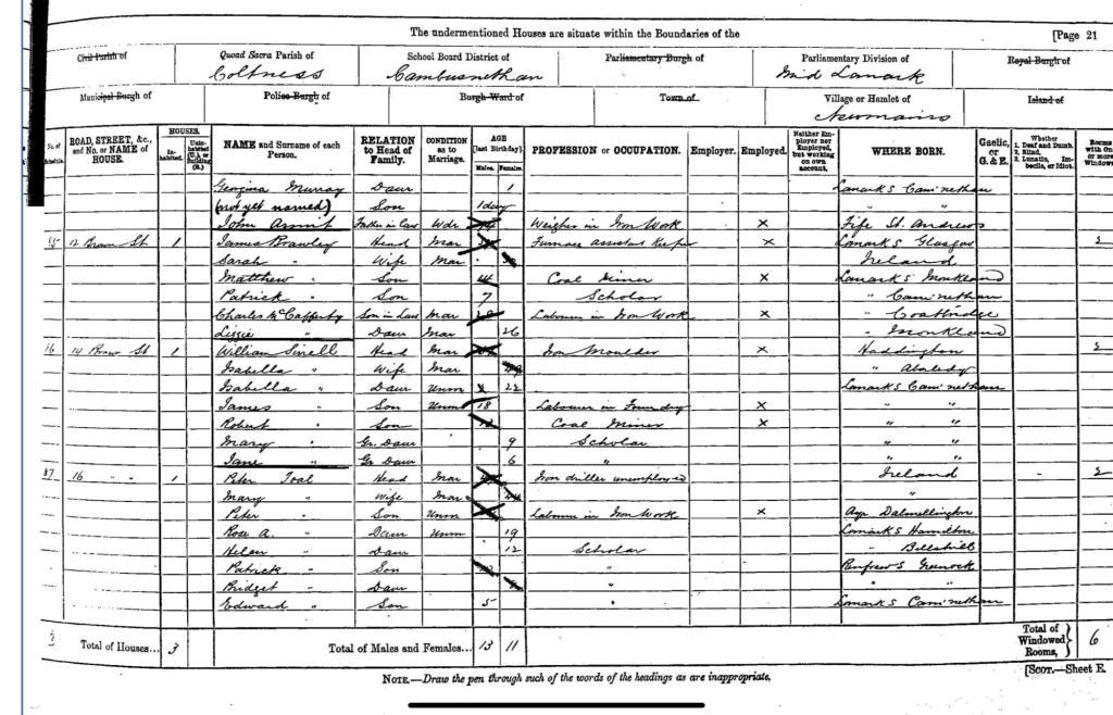 James and Sarah were married in 1856 in Ayrshire. James was born in Glasgow to Irish parents. The Brawleys were from Faughanvale in County Derry. Sarah was born in County Mayo but came to Scotland at a fairly young age. After their marriage the couple moved to Lanarkshire where they went where James’s work opportunities took them for a number of years between Ayrshire, Old Monkland and Newmains (both in Lanarkshire) before settling permanently Newmains.