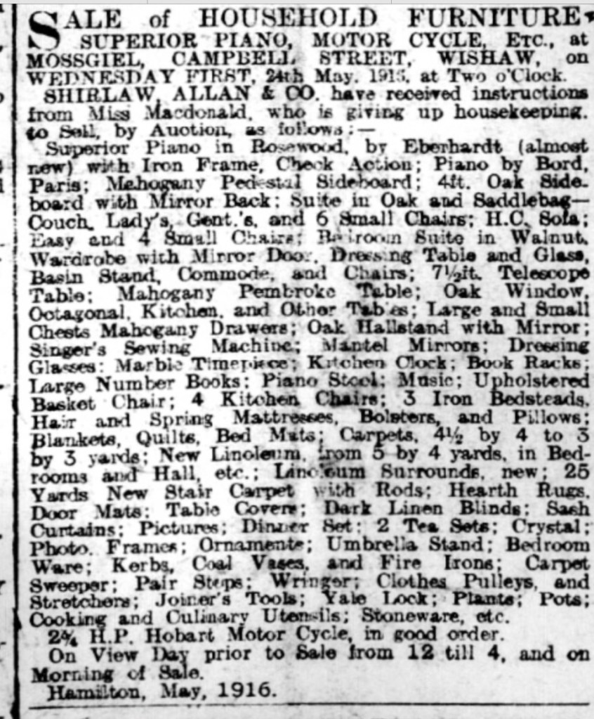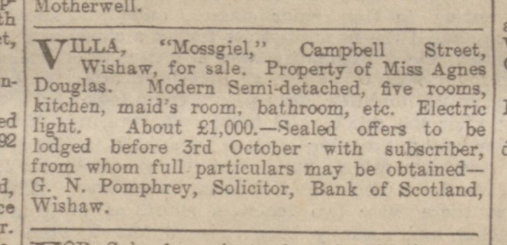 In 1911 Elizabeth McCafferty was employed as a domestic servant at Mossgiel, Campbell Street in Wishaw. This advert from 1922 gives a description of the house.