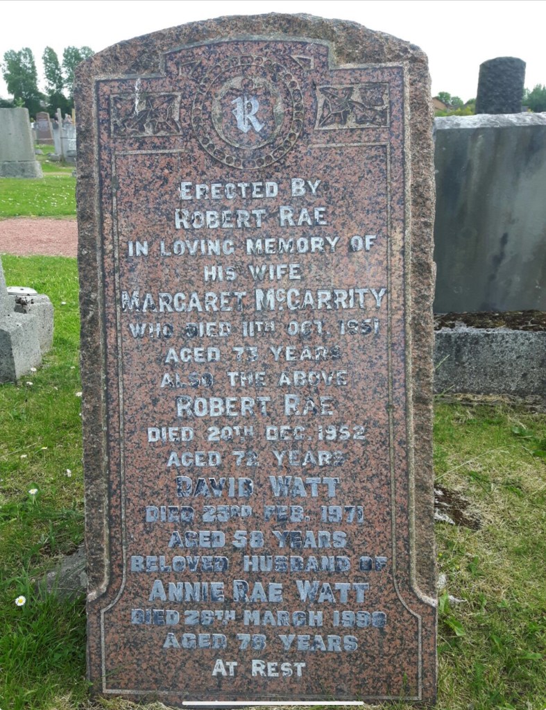 Maggie was 72 when she died. The cause of death was coronary thrombosis. Robert died just a year later in December 1952. They are buried ar Airbles Cemetery in Motherwell.