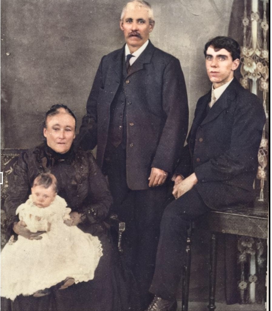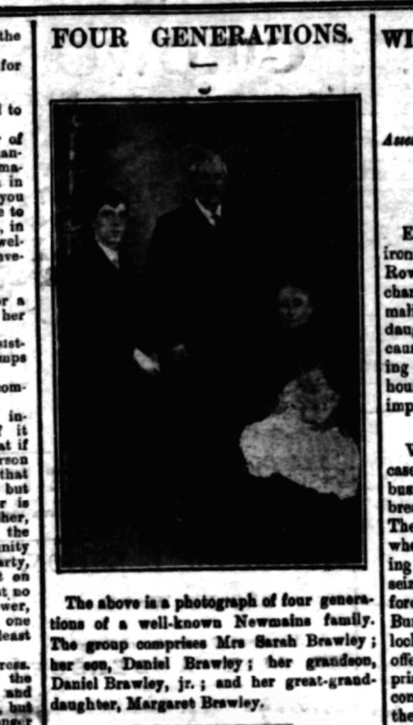 In 1912 Sarah’s grandson Daniel (Daniel’s son) and his wife Mary Berry welcomed their first child Margaret Corrigan Brawley. To commemorate the event a special photograph was commissioned. It’s a wonderful photo showing 4 generations.