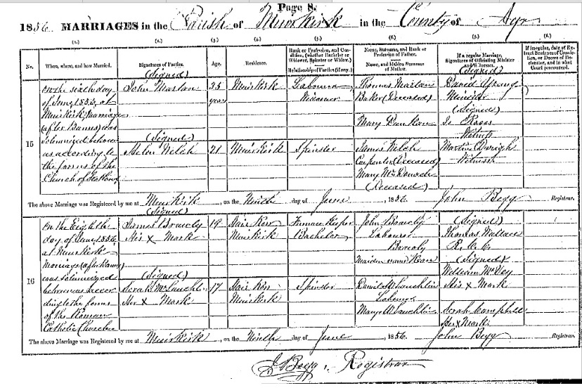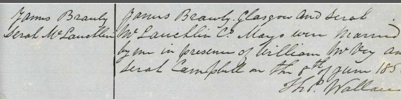 Sarah’s mum is recorded as Mary McLaughlin when her name was Elizabeth Reilly. You can see that neither James nor Sarah could sign their own names unlike the couple above who were married in the Church of Scotland suggesting they were not immigrants and had perhaps had better opportunities.