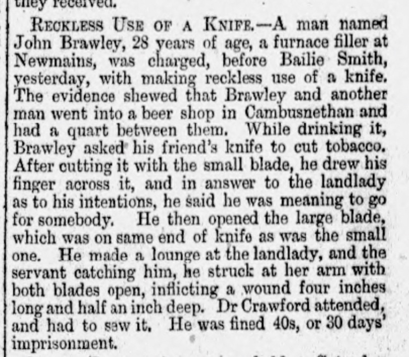 The article from 1885 January 1885 shows he was given the option of a hefty fine or a prison sentence. There really was no choice and John was headed for Duke Street Prison. This left Roseann in a difficult position. Without John’s earnings she too was at the mercy for the parish. January 1885 also saw the birth of their 3rd child, Sarah so the timing could not have been worse. Remarkably, John did find the money to pay the fine and he was released early. It was not exactly a happy homecoming as just a few months later Roseann was back at the poorhouse seeking help having been deserted by her husband. The Brawleys really would’ve been the talk of the steamie!