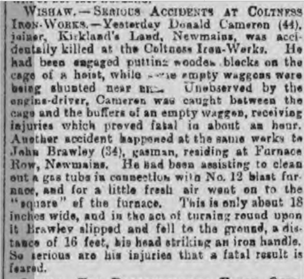 In March 1892 Sarah received word that her eldest son had been killed in an accident at the ironworks. It was reported in the local paper.