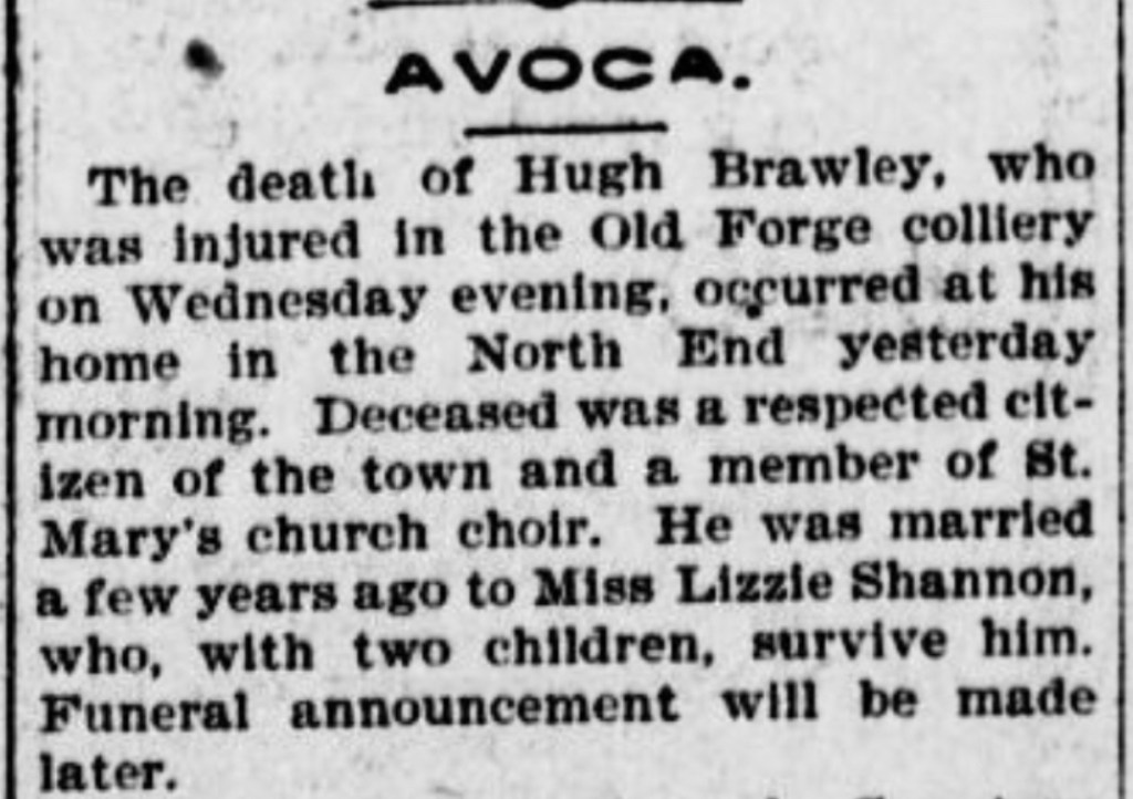 In October 1893 Hugh 24 year old Hugh Brawley married Alice Shannon in Lackawanna county, Pennsylvania. The following year they welcomed twin girls Sarah and Ellen. Hugh had settled well in America. It’s from Hugh’s family that I got the above photo of Sarah. I’m very grateful to have it. That branch of the family has been great at preserving mementos. I love this picture of Hugh and Alice.