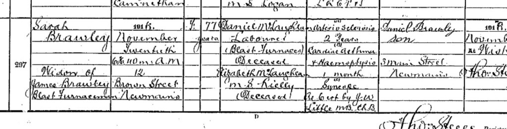 In the 1901 census Sarah and James were living at 12 Brown Street, Newmains along with Patrick who was 16. Also in the house was Elizabeth who had split from her husband Charles. Granddaughter Sarah Brawley also lived with them. She was Daniel’s daughter and presumably stayed with her grandparents due to overcrowding in her own family home.