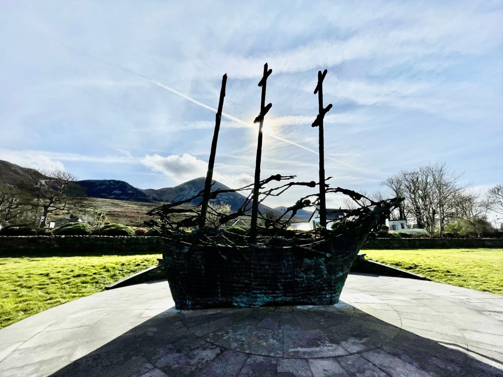 In Murrisk we visited the National Famine Memorial which commemorates the millions who perished during the Great Hunger. The sculpture represents the “coffin ships” that sailed from Ireland carrying emigrants fleeing the famine. It is really moving. It sits at the foot of Croagh Patrick with views over the Atlantic and the beauty of the setting just made me feel sad. They had to leave all this behind.