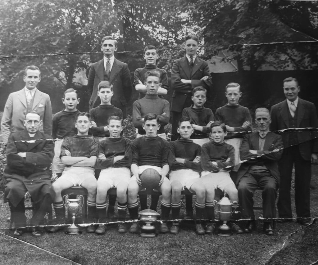 Here’s another photo featuring Hugh and Dan from the 1930s. My granda was very much into football and was very much involved with local teams. Here he is on the left in the back row while Dan is the second boy from the right in the front row. I recognise the location of the photo as being the grounds of St Brigid’s church in Newmains which at that time was also the school.