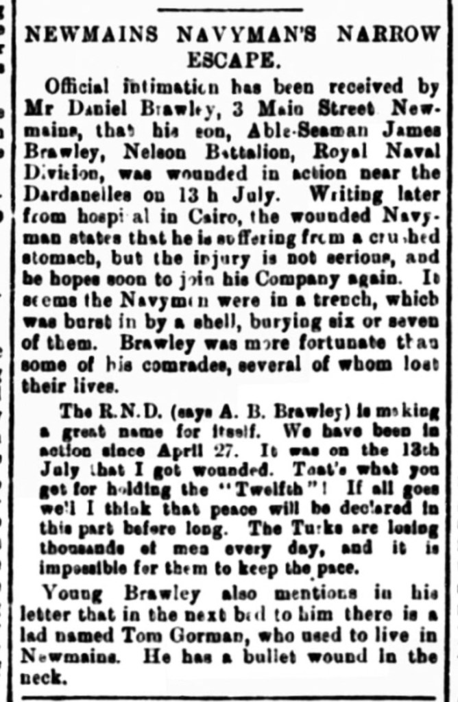 On 6 August 1915this article appeared in the local newspaper. James, wounded but apparently in good spirits, wrote to his parents to let them know he had not been too seriously injured and would soon be fighting fit. A “crushed stomach” does sound quite nasty I would say.