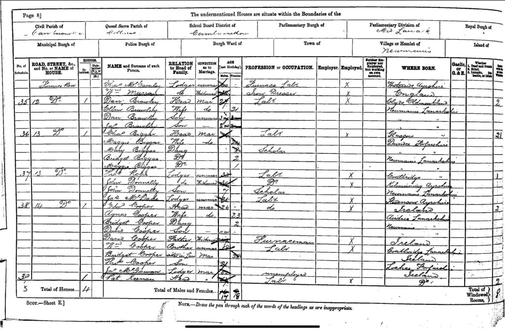 On April 5 1891 the census for Scotland was taken. On this page we have Daniel and Ellen with their 2 sons and at the foot of the page we see Pat Keenan who was Ellen’s father. (Edward Cooper who was living at number 14 with his wife and family later became my granny’s stepfather)