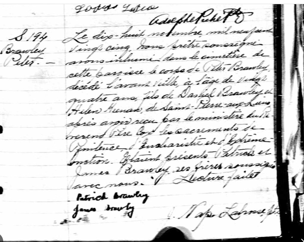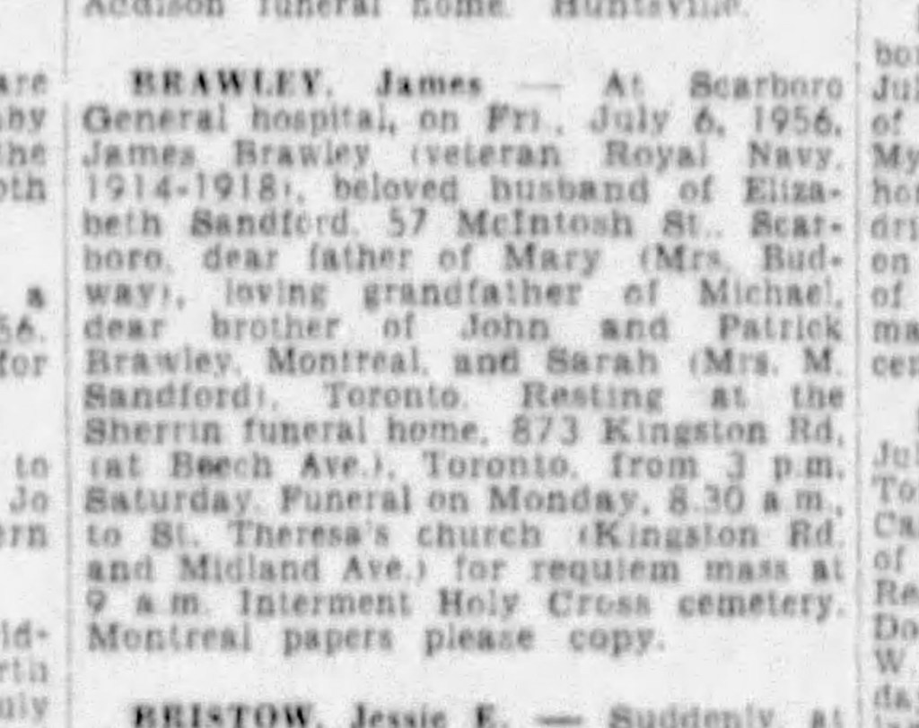 Of the 10 surviving Brawley siblings, James was the first of 5 to emigrate to Canada – sister Sarah , who married Elizabeth’s brother Matthew Sandford, and brothers Patrick, John and Peter.