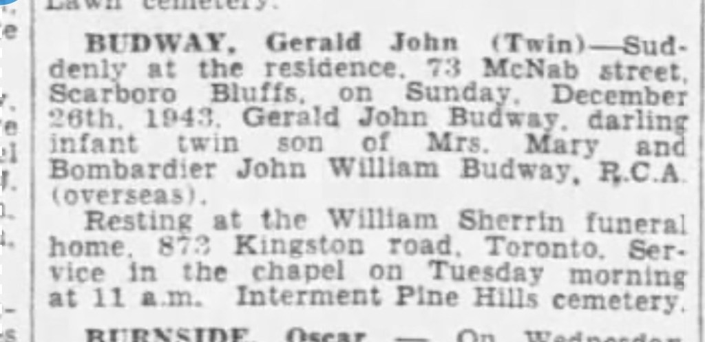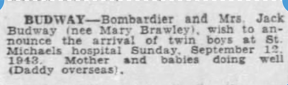 In 1943 James became a grandfather when Mary gave birth to twin boys, Gerald and Michael. This was wartime of course and Jack was overseas meaning Mary must have really leaned on her parents for support.