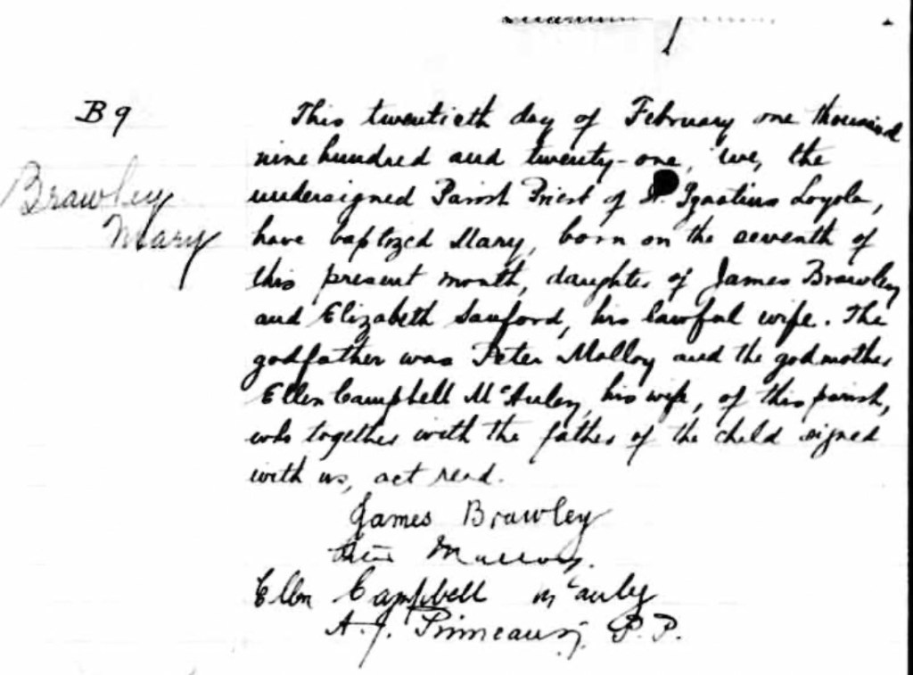 James and Elizabeth had a daughter, Mary who in 1921 and they returned to the same church to have her baptised.
